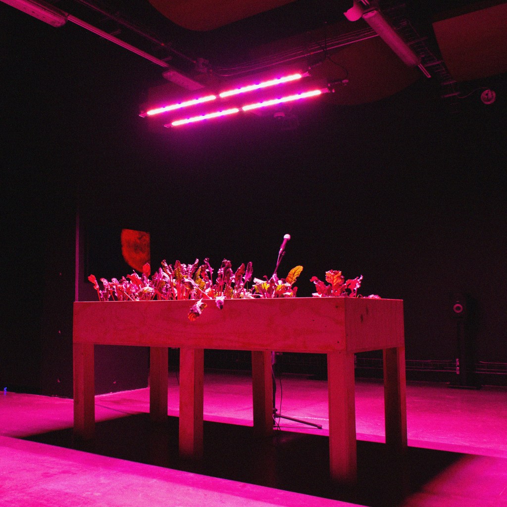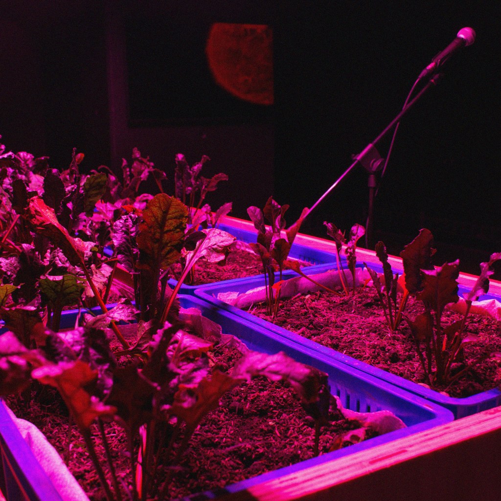 Consists of a small beet crop of 12 plants, an artificial lighting system, a multichannel installation, a transducer device connected to an open microphone, and a video