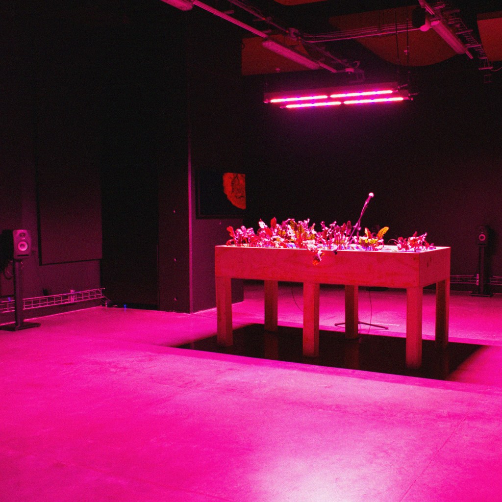 In this installation, horticulture is presented as a device of joy, pleasure, resistance, and autonomy in the face of an uncertain future. Here, the violet light of the lamps and a video of the sun, the sine waves, the foley sounds and the human voice, convert the gallery into a space of nourishment, contemplation and deep listening. This installation presents a space of sensorial subjectivity where the reception of sound and light of plants and humans converge.