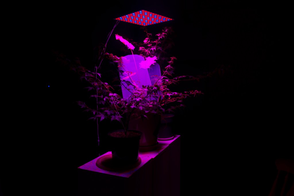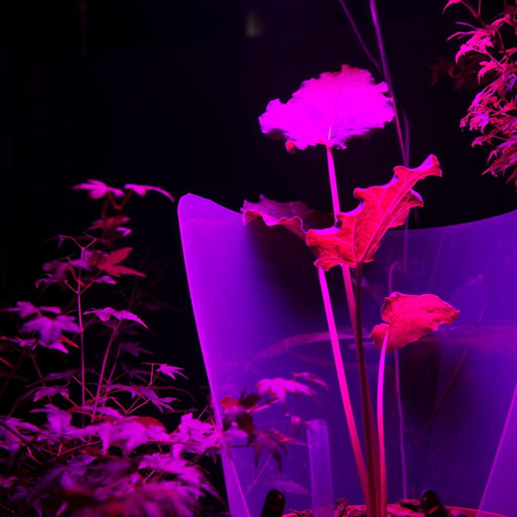 In Yorkshire, it is traditional that rhubarb plants grow in dark shades as part of a process known as forcing. After being exposed to frost, the buds are moved into dark shades to encourage starch production and growth. In forcing, the stems become exceptionally tall and sweet and acquire a red-pinkish colour result of the arithmetical energy calculations that rhubarbs perform in the absence of sunlight. The stems, release acoustic energy after overproducing chemical energy, creating a sound that is as unique as their colour and flavour, which is the focus of this installation. Duncan and David composed a piece using recordings from forced rhubarb yards and sine waves that stimulate the crops; these sounds will blend with the cooking sounds of keer with rhubarb sweet, prepared by Ruchi. In the exhibition, a rhubarb grows aided by acoustic invigoration and LED lights while the audience can enjoy the sounds in a chair vibrating at the frequencies at which plants communicate.