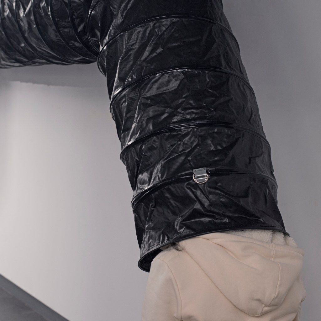 ‘The Calder in your bones’ is a sound installation made with industrial duct, fur and electroacoustic bone transducers. The piece aims to draw attention towards the health of the River Calder, which is the principal fluvial source for farms in the Calderdale and Kirklees boroughs, nourishing the growth of rhubarb, pears, blueberries, potatoes, tomatoes and many other species that feed the community of this region. The Calder was affected by industrial waste for decades, and today is subjected to substantial sewage leaks, making it England’s second most polluted river. This problem can be solved if the contaminating water firms take action to sustain the river’s well-being, which they are currently failing to do, as researchers and activists emphatically point out. As such this installation also takes an explicitly activist stance.