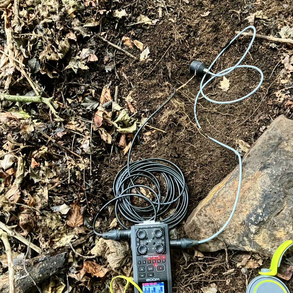 Underwater and subterranean recordings from the River Calder and its basin in Northern England draw attention and concern towards the sewage leaks that make it England’s second most polluted river. These sounds are evidence of the diversity of amphibians, fishes and plants in rural areas diminished in urban zones, a possible effect of pollution. This problem can stop if the contaminating water firms take action to sustain the river’s well-being, which they are failing to do, as researchers and activists emphatically point out. This fluvial body is the principal source for farms in the Calderdale and Kirklees boroughs, nourishing the growth of rhubarbs, pears, blueberries, potatoes, tomatoes and many other species that feed the community of this Northern England region. The Calder irrigates soil with high contents of carbonate, a product of layers of chalk stacked hundreds of metres deep since the Carboniferous period, 310 million years ago. Then, this region had an exuberant and healthy biodiversity comparable to the Amazonas tropical forest when Microsauria, Eryops, Diplocaulus, Labyrinthodontia, Nectridea and other amphibian families proliferated until a rainforest collapse extinguished them and many other life forms after a series of climate changes, which emerges as a warning in this artwork.