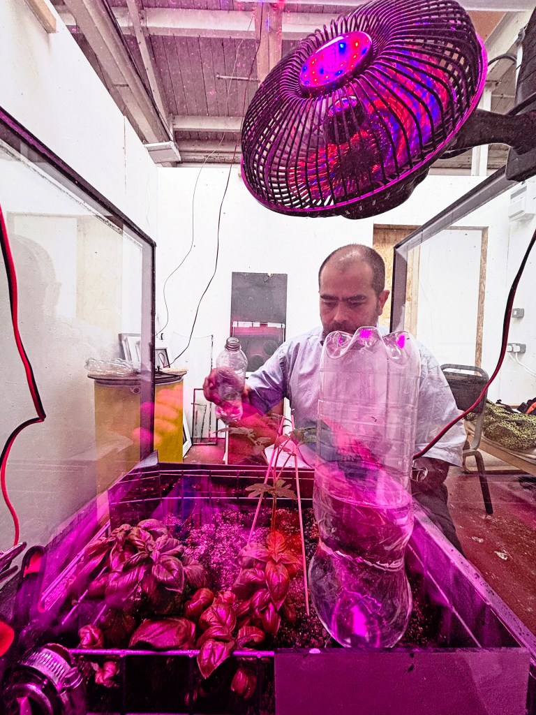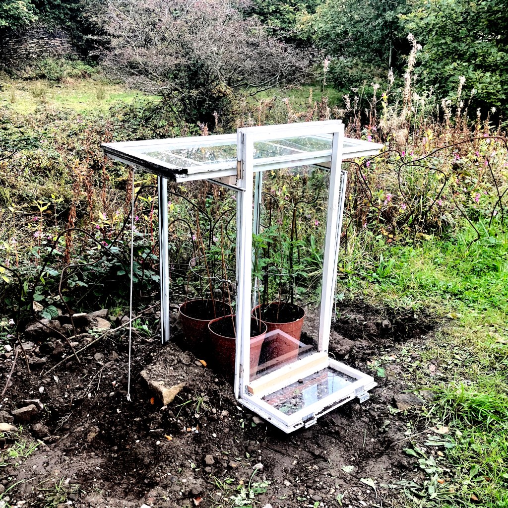 Experiment advanced in a 135 liter-pot. Soil grown locally in Slaithwaite. Tomato planted with basil and chives, plants that repel pests and support biodiversity. DIY automated watering system 2 liters per day.Experiment implementing discarded materials -when available- (Prototype as of Day 53rd) found in the industrial area of Holme Mills in Huddersfield.